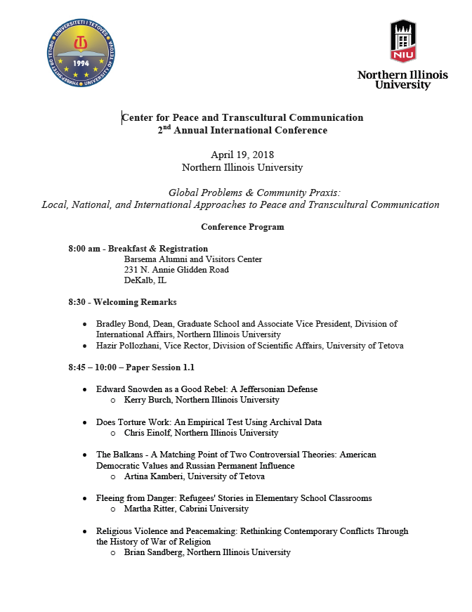 Center for Peace and Transcultural Communication started its activity on 2015 as a joint initiative between University of Tetova and Northern Illinois University in Chicago, USA.