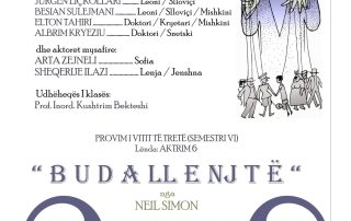 The audience in Kicevo warmly welcomed the comedy ” Fools ” by Neil Simon, a performance from the third-year acting class directed by Prof. Kushtrim Bekteshi. The cast included students Edmond Sadiki, Besian Sulejmani, Elton Tahiri, Plumb Beadini, Jurgen Liçkollari, and Albrim Kryeziu, along with guest actresses Arta Zejneli and Sheqerije Ilazi. The cultural event was graced by the presence of the Dean of the Faculty of Arts, Prof. Senad Abduli.