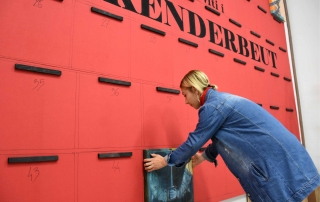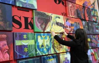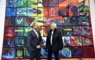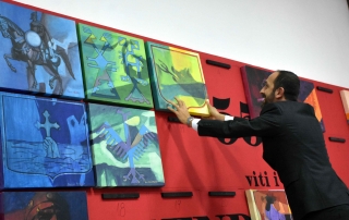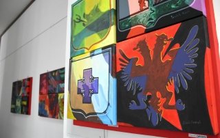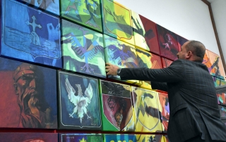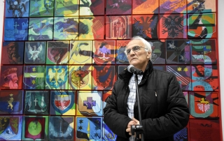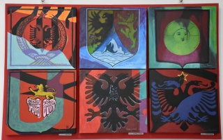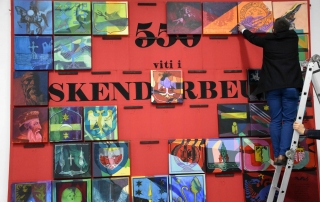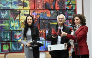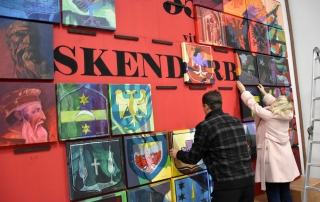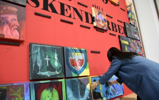 The author of this exhibition, the painter Prof. Dr. Miftar Memeti thanked all other painters, who have been part of this mosaic. “This work it’s not just mine, I’m the coordinator of this work. These paintings were painted by the students who have graduated a few years ago, such as painters, sculptors, graphic designers. The image of this mosaic is Skanderbeg and the eagle. It is inspired from the topics, motifs, such as various emblems of our nation, Skanderbeg’s portraits, and the transformation of the eagle from folklore. The 50 motifs, when brought together show the image of Skanderbeg”- said Prof. Dr. Miftar Memeti.