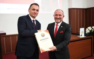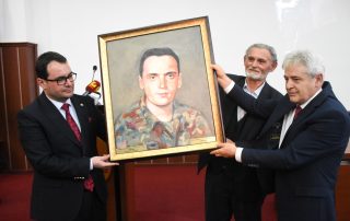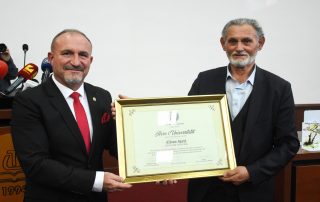 The decision of the Senate of the University of Tetova to declare the martyr of the Nation Alban Ajeti the HERO OF THE UNIVERSITY, to his father, Sheqir Ajeti, was bestowed by the President of the Senate, Prof. Dr. Vullnet Ameti. Also, it was bestowed the Monograph of the University along with the logo and flag of the University of Tetova, as well as the portrait of the first and historical Rector, Prof. Dr. Fadil Sulejmani, as well as the painting with the portrait of the martyr Alban Ajeti.