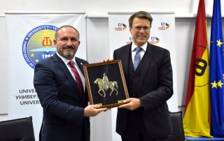After his lecture, in recognition of his gratitude and respect for cooperation with the University of Tetova, the Rector, Prof. Dr. Vullnet Ameti, to the Ambassador of the European Union to Macedonia, his Excellency, Samuel Zhbogar conferred a gift with the portrait of our national hero George Kastrioti Skanderbeg.
