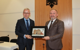 At the end of the proceedings of the aforementioned conference, the Rector of UT, to the host of the aforementioned meeting, the Rector of the University, “F. S. Noli ”, Prof. Dr. Ali Jashari donated the portrait of the founder and first Rector of UT, Prof. Dr. Fadil Sulejmani and the newest university publishing. Also, during our stay in Korça, our rector was also received by the Mayor of Korça, Mr. Sotiraq Filo, where he held a warm friendly conversation with special emphasis on higher education in all Albanian territories. They agreed that only through cooperation, organization of meetings of this nature will enhance the general educational – scientific processes. To the Mayor of Korça, our Rector donated the mosaic of the House of the Alphabet in Bitola and some scientific publications of our University.