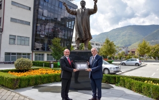 After the meeting, the Rector of UT, Prof. Dr. Vullnet Ameti and the Ambassador of the Republic of Kosovo in our country, Gjergj Dedaj visited the monument “Beacon of Remembrance” and the statue of the first Rector of UT, Prof. Dr. Fadil Sulejmani, as well as exchanged symbolic gifts with each other.