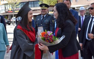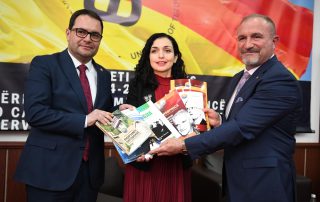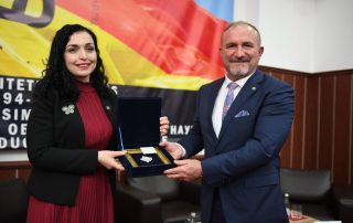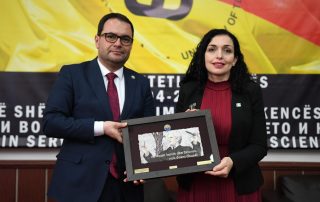 At the end of the meeting, the President of the Republic of Kosovo from the Rector Prof. Dr. Kushtrim Ahmeti accepted the portrait of the founder and the first Rector of UT, Prof. Dr. Fadil Sulejmani, while the President of the Senate Prof. Dr. Vullnet Ameti bestowed to her the Monograph of the University of Tetova, along with several other scientific publications of the University of Tetova, among which the author’s book, Prof. Dr. Nusret Pllana titled: ” Terror of invading Serbia over Albanians, 1844-1999.