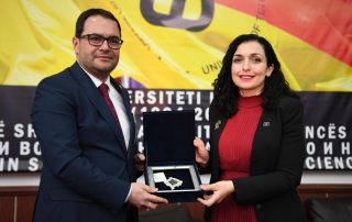 The President of the Republic of Kosovo, Vjosa Osmani, during her stay at the University of Tetova held a meeting with the Rector of the University of Tetova, Prof. Dr. Kushtrim Ahmeti, President of the Senate, Prof. Dr. Vullnet Ameti and other leaders, while afterwards, in the Amphitheater “Sevasti and Parashqevi Qiriazi”, in front of students and professors, she held a lecture on the topic: “Regional political and security challenges”.