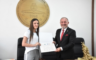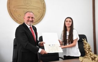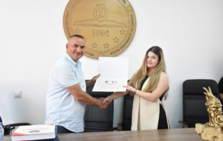 At the end, for the students participating in the Summer School 2022, were awarded certificates and some symbolic gifts together with the Monograph of the UT, by the Rector, Prof. Dr. Vullnet Ameti and the Head of the Public Relations Office at the U.S. Embassy in Skopje, Mrs. Jaewon – Oh. Also, to Ms. Jaewon – Oh, the Rector Prof. Dr. Vullnet Ameti bestowed a gift with a portrait of Mother Teresa and some publications of our University.