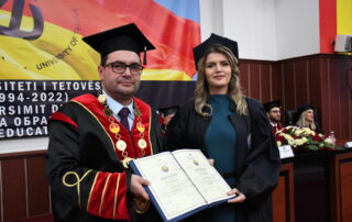 On behalf of all the graduates, with occasion speech addressed Dr. Vegim Zhaku, who said that regardless of sacrifice, desire and will, the realization of the goal remains crippled if there are no individuals who are seasoned for the continuity of the processes essential to our nation. “Like the field of my PhD, which has to do with the reproduction and continuation of the species, so these individuals with ideology, intelligence, vigilance selected from among us the best students, to be part of the staff, and for this I sincerely thank I am the leadership of the University of Tetova, without whom even these doctoral studies could not proceed further, and this has to do with the foresight and vision that these individuals have, because we know that the mind (reason) is a source of important knowledge, while foresight, a serious source of culture. It is quite difficult, even impossible, for a man with reason but no foresight to get anywhere with what he knows, even if he knows many things and understands many things. With the completion of these third cycle studies, it was possible to open new horizons and ranges, but also responsibilities for correctness, transparency, work, knowledge, dedication, because the development and progress of a nation depends on the ideological education of its individuals”- said Dr. Vegim Zhaku.