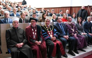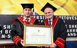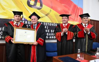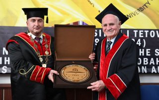 After receiving the title Doctor Honoris Causa from Rector Prof. Dr. Jusuf Zejneli, the laureate Nevzat Halili addressed the attendees with words of gratitude for the respect shown towards his personality and the University of Tetova.“With the opening of this University, with the legalization of this University through many sacrifices, just as I was imprisoned, many of our compatriots were also in prison, such as the Albanian Mandela, Adem Demaçi, who spent 26 years in prison, the second Mandela, Mehmetriza Gega, who spent 16 years in prison. The establishment of the University was not easy; it was difficult. It might not have been so difficult if we had had greater understanding, because there was repression, as the politics of the time were such that, as soon as we had passed communism, the old beliefs still held that Albanians could be “the man with the saw on the shoulder”. But today, no one can call Albanians ‘the man with the saw on the shoulder’ because around 15,000 students’ study at this University, and many students have graduated. In North Macedonia, from the establishment of the Ss. Cyril and Methodius University until the 1990s, only 430 Albanians graduated, many of whom were from Kosovo, Presevo, Bujanoc, and even from Montenegro.” – stated Mr. Nevzat Halili.