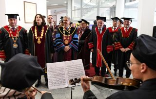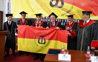 Afterward, the Secretary General, Mr. Adem Beadini, on behalf of the university services, presented the diploma to Rector Prof. Dr. Jusuf Zejneli to award the title of Doctor Honoris Causa to Professor Nevzat Halili. Along with the diploma, the laureate of the University of Tetova was also awarded the university’s symbols, the logo, and the flag.
