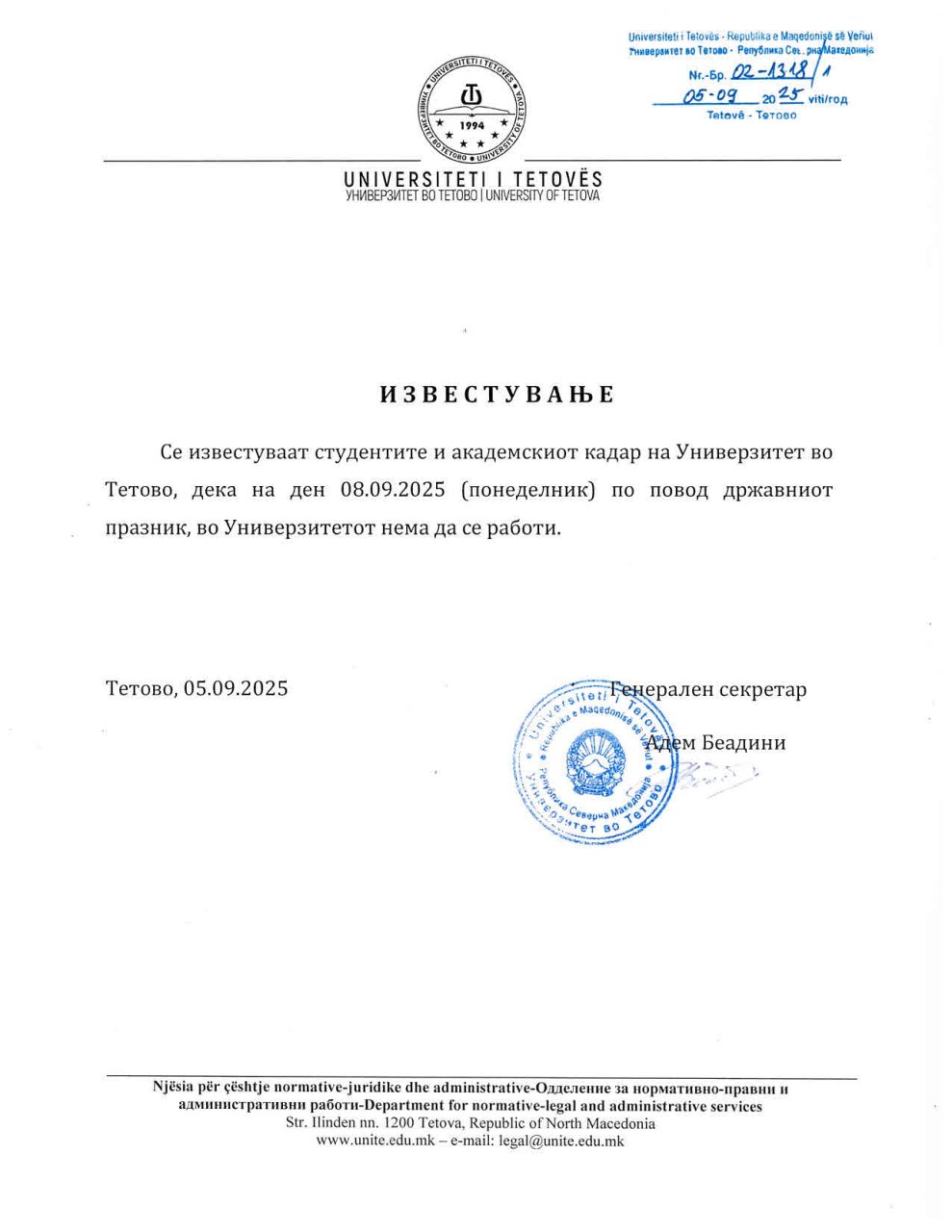 Известување (неработен ден) Besar Huseini2025-09-05T11:05:31+02:00Септември 05, 2025| Related Posts Известување (неработен ден) Декември 05, 2025 Билтен бр. 254 Декември 01, 2025 Известување (неработен ден) Ноември 21, 2025