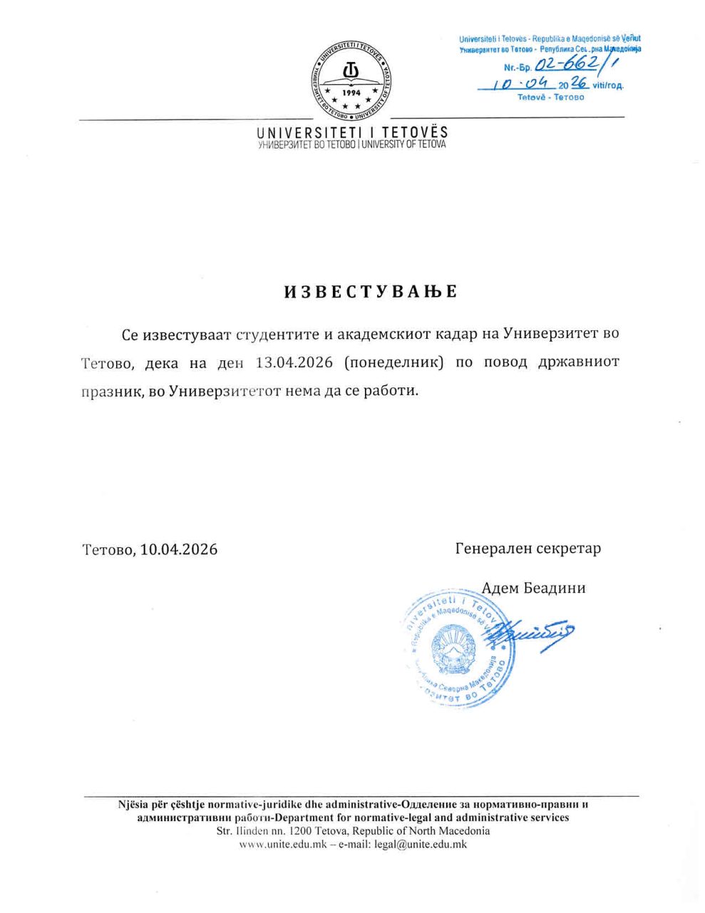 Известување (неработен ден) Besar Huseini2026-04-10T10:58:42+02:00Април 10, 2026| Related Posts Билтен бр. 261 Април 06, 2026 Известување за запишување на летниот семестар 2025-26 – II циклус Март 19, 2026 Билтен бр. 260 Март 17, 2026