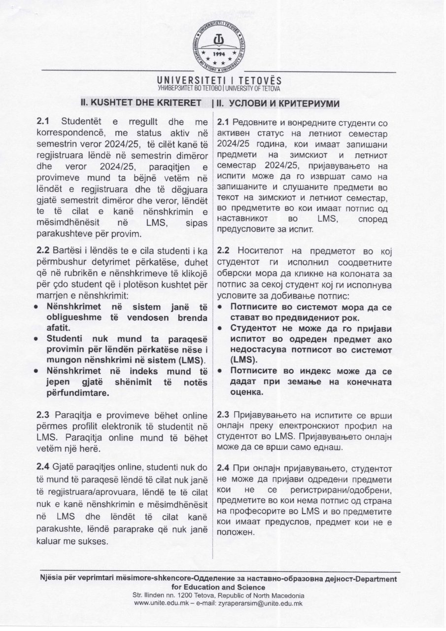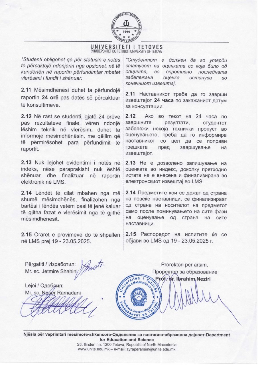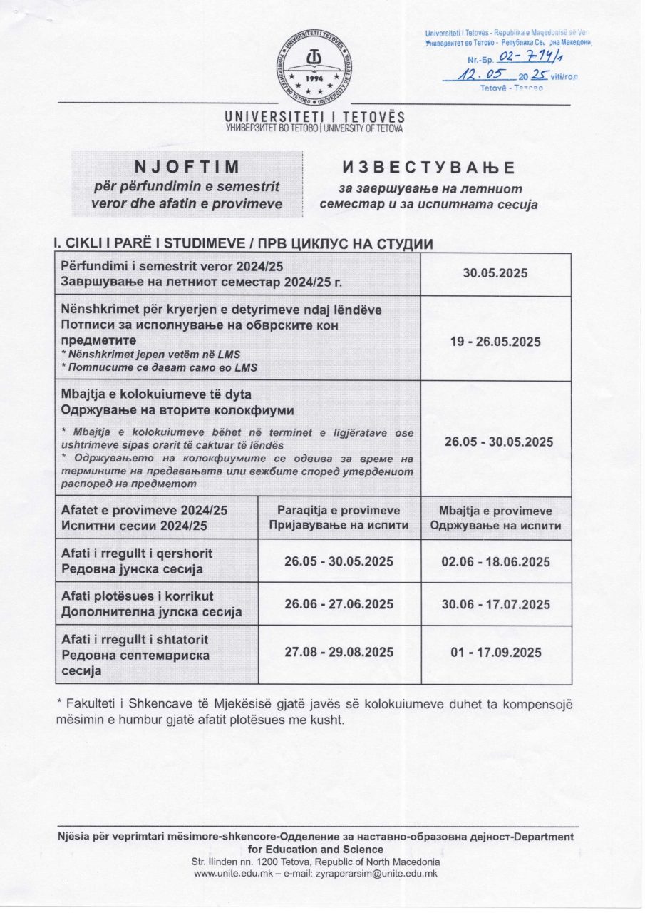 Известување за завршување на летниот семестар и за испитната сесија 2024-25 Besar Huseini2025-05-12T17:24:40+02:00Мај 12, 2025| Related Posts Известување (неработен ден) Декември 05, 2025 Билтен бр. 254 Декември 01, 2025 Известување (неработен ден) Ноември 21, 2025