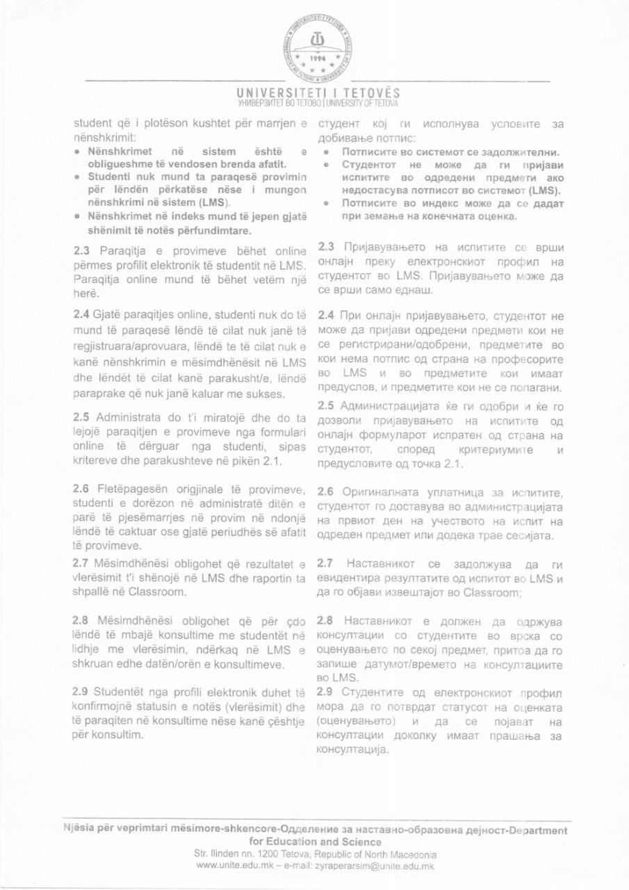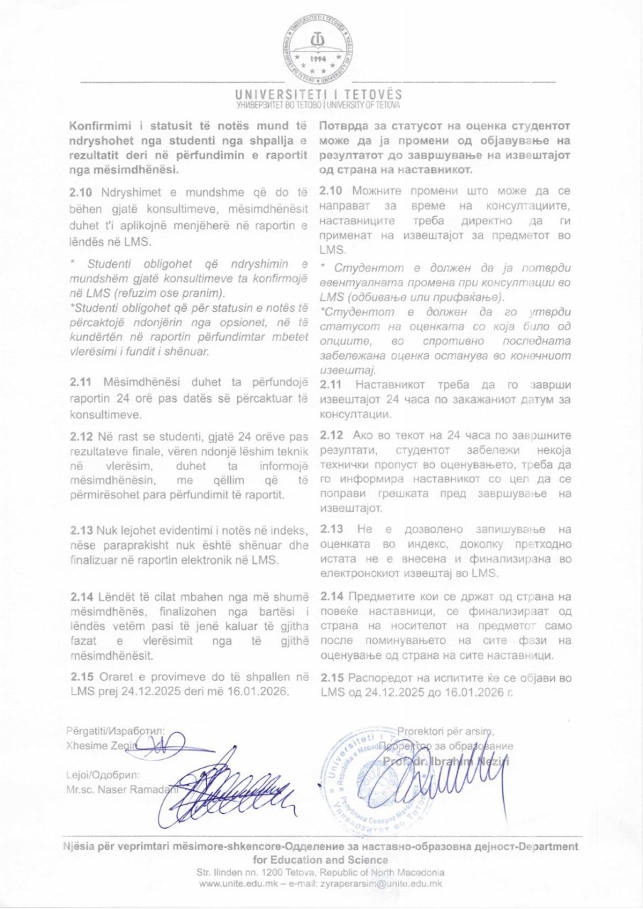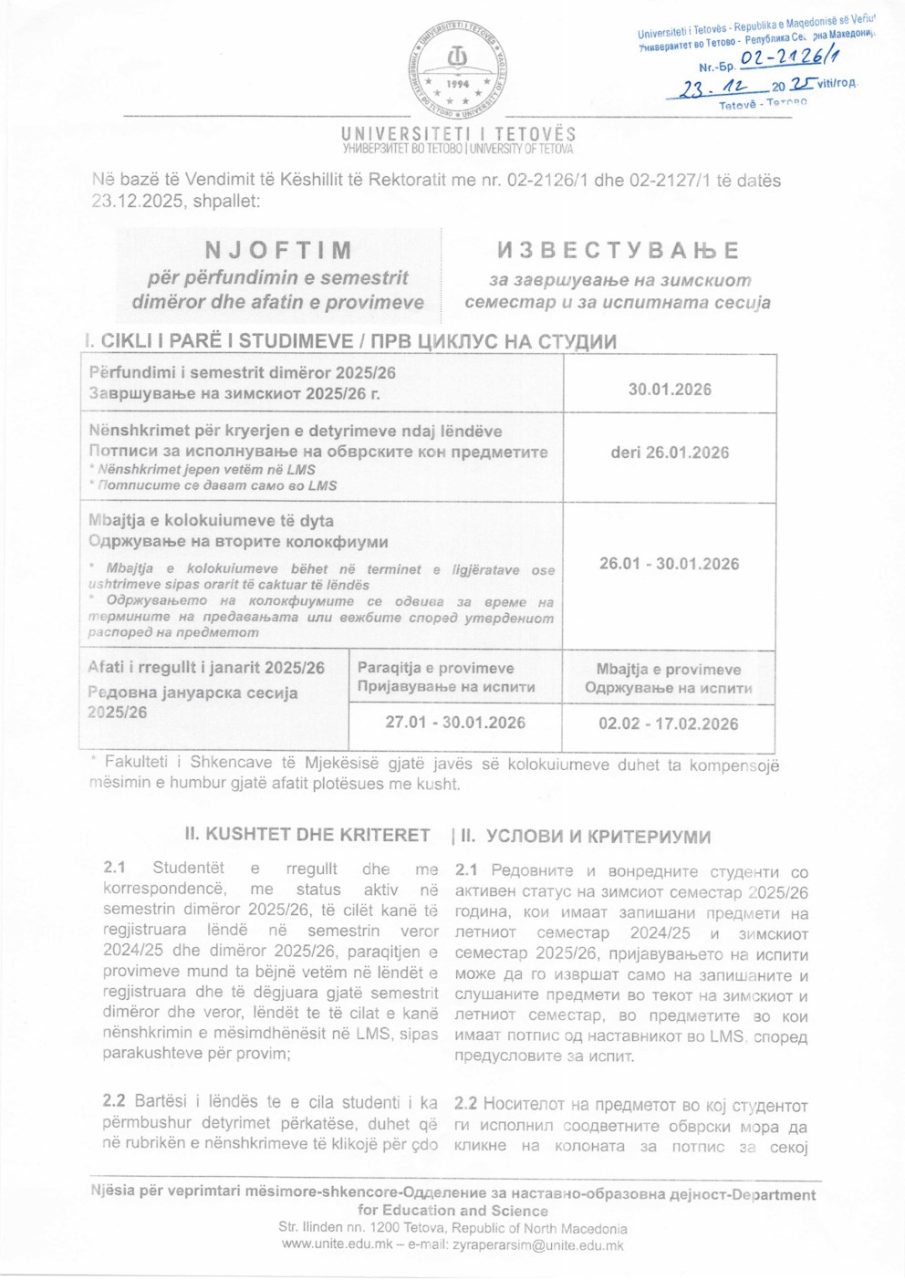 Известување за завршување на зимскиот семестар и за испитната сесија Besar Huseini2025-12-24T20:03:38+02:00Декември 24, 2025| Related Posts Билтен бр. 256 Декември 26, 2025 Известување за промена на начинот на студирање во летниот семестар 2025-26 Декември 24, 2025 Известување (неработен ден) Декември 16, 2025