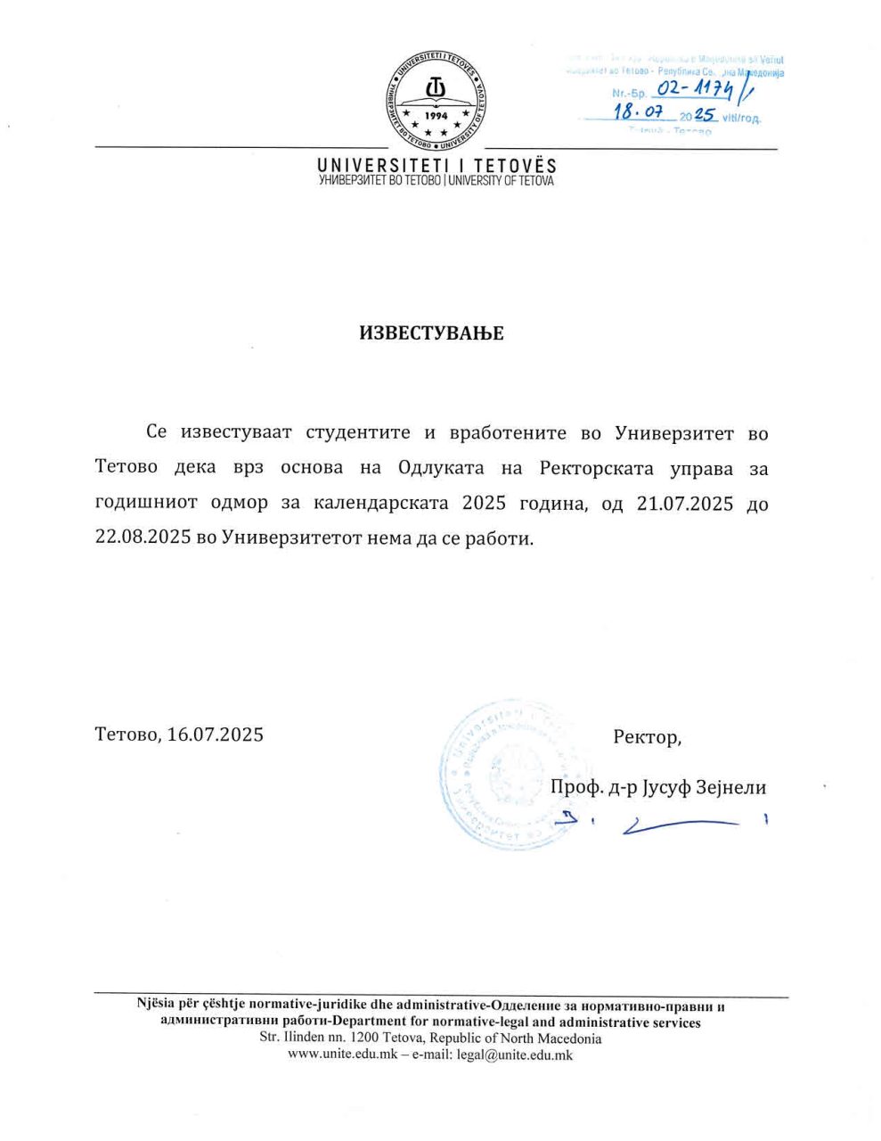 Известување (годишен одмор) Besar Huseini2025-07-18T11:30:29+02:00јули 18, 2025| Related Posts Известување (неработен ден) Декември 05, 2025 Билтен бр. 254 Декември 01, 2025 Известување (неработен ден) Ноември 21, 2025