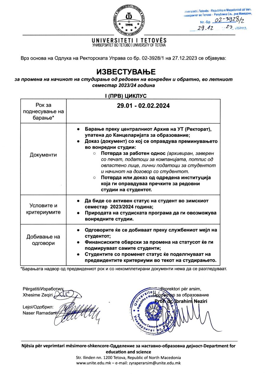 Врз основа на член 103 и 149 од Законот за високо образование на РСМ (82/18), Статутот на Универзитет во Тетово, Правилникот за условите, критериумите и одредбите за запишување студенти на втор циклус студии, Одлука од Советот на Ректорат со бр. 02-663/11 на 16.03.2023, врз основа [...]