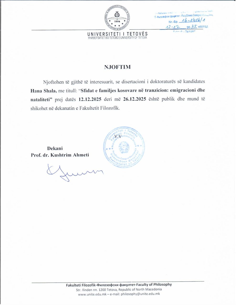 Njoftim për bërjen publike të disertacionit të doktoraturës Besar Huseini2025-12-13T14:06:05+02:00Dhjetor 13, 2025| Related Posts Njoftim (ditë jo pune) Dhjetor 05, 2025 Buletini nr. 254 Dhjetor 01, 2025 Njoftim (ditë jo pune) Nëntor 21, 2025