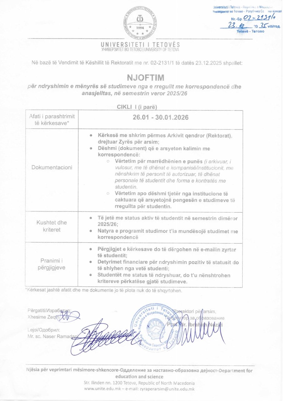 Njoftim për ndryshimin e mënyrës së studimeve në semestrin veror 2025-26 Besar Huseini2025-12-24T20:06:12+02:00Dhjetor 24, 2025| Related Posts Buletini nr. 256 Dhjetor 26, 2025 Njoftim për përfundimin e semstrit dimëror dhe afatin e provimeve Dhjetor 24, 2025 Njoftim për bërjen publike të disertacionit të doktoraturës Dhjetor 18, 2025