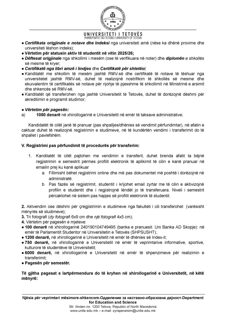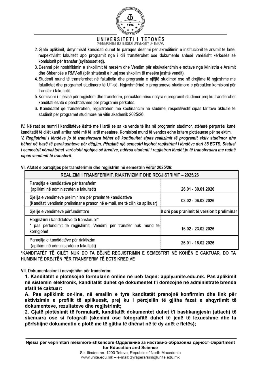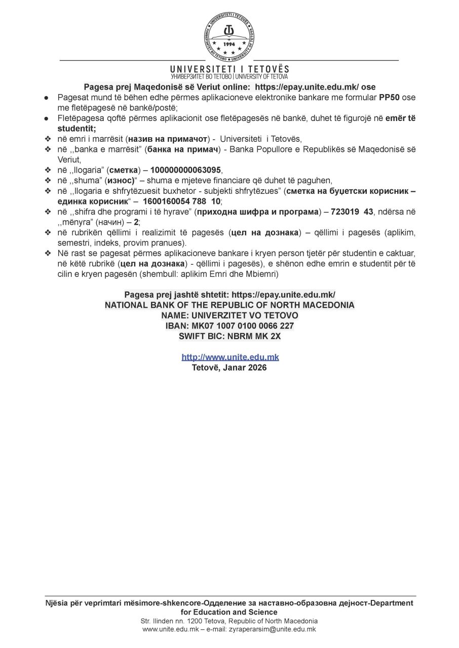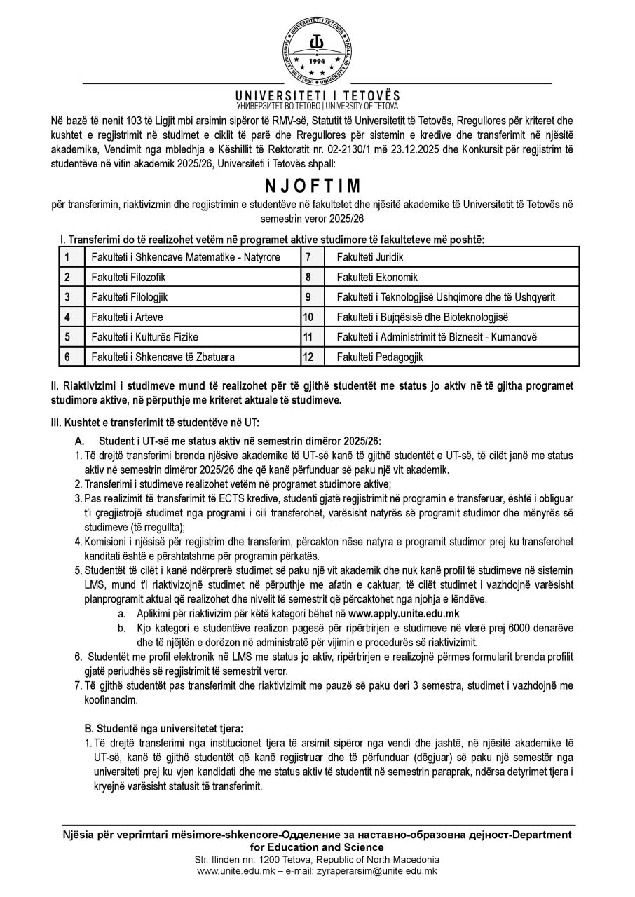 Njoftim për transferimin, riaktivizimin dhe regjistrimin e studentëve në semestrin veror 2025-26 Besar Huseini2026-01-07T12:34:36+02:00Janar 07, 2026| Related Posts Buletini nr. 256 Dhjetor 26, 2025 Njoftim për ndryshimin e mënyrës së studimeve në semestrin veror 2025-26 Dhjetor 24, 2025 Njoftim për përfundimin e semstrit dimëror dhe afatin e provimeve Dhjetor 24, 2025