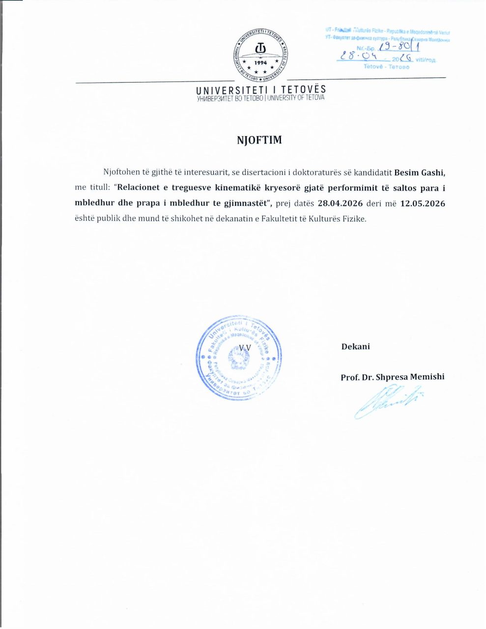 Njoftimi për bërjen publike të disertacionit të doktoraturës Besar Huseini2026-04-28T19:12:04+02:00Prill 28, 2026| Related Posts Buletini nr. 262 Prill 22, 2026 Njoftim (ditë jo pune) Prill 10, 2026 Njoftim për bërjen publike të disertacionit të doktoraturës Prill 07, 2026