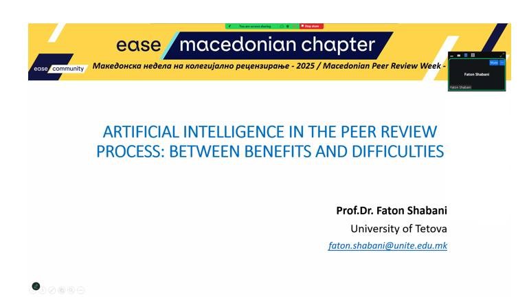 Në cilësinë e anëtarit të Asociacionit Evropian të Redaktorëve Shkencorë (AERSH), Prof. Dr. Faton Shabani prezantoi hulumtimin me titull: “Intelegjenca artificiale në procesin e recensionimit: ndërmjet përfitimeve dhe vështirësive” në uebinarin me temë “Recensionimi në erën e inteligjencës artificiale: perspektiva maqedonase dhe përgjegjësitë globale” organizuar nga AERSH, më datë 25 shtator 2025.