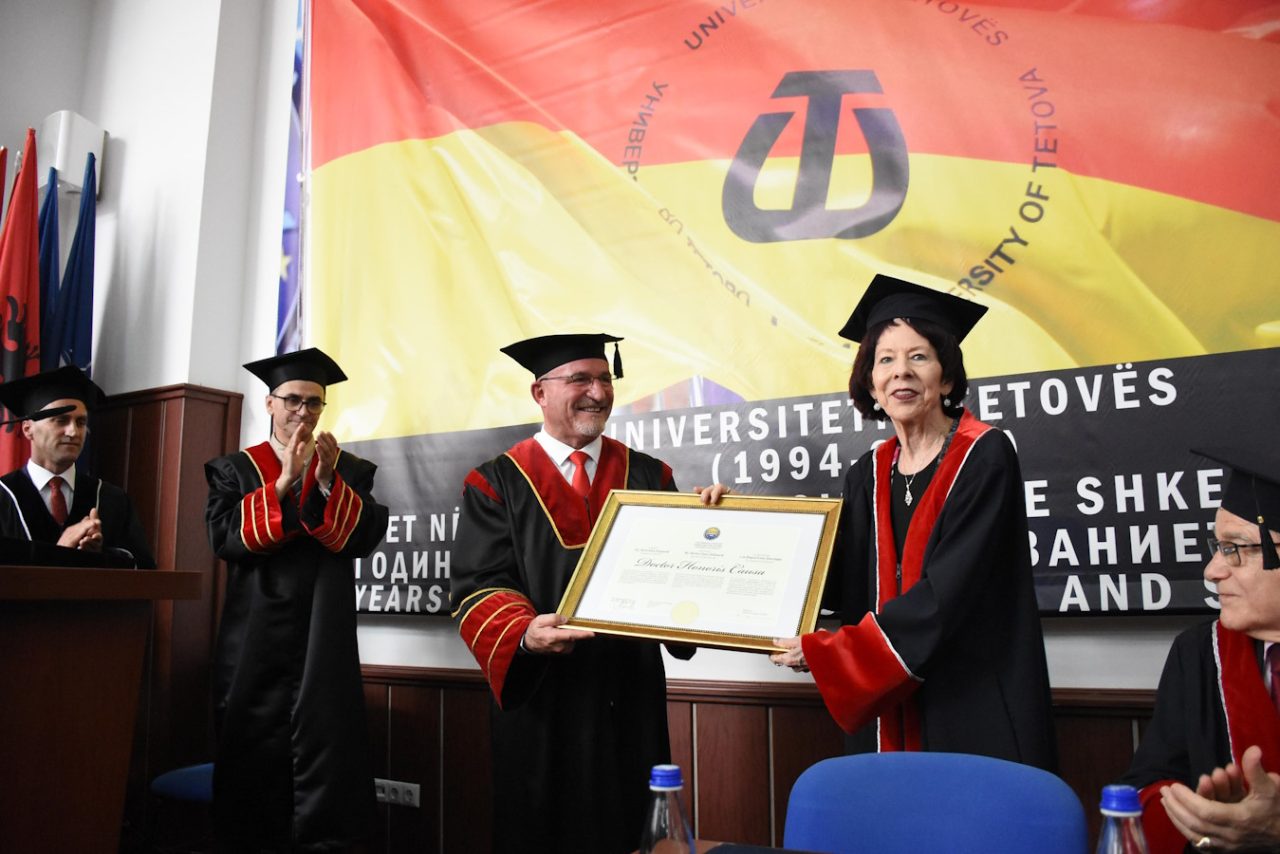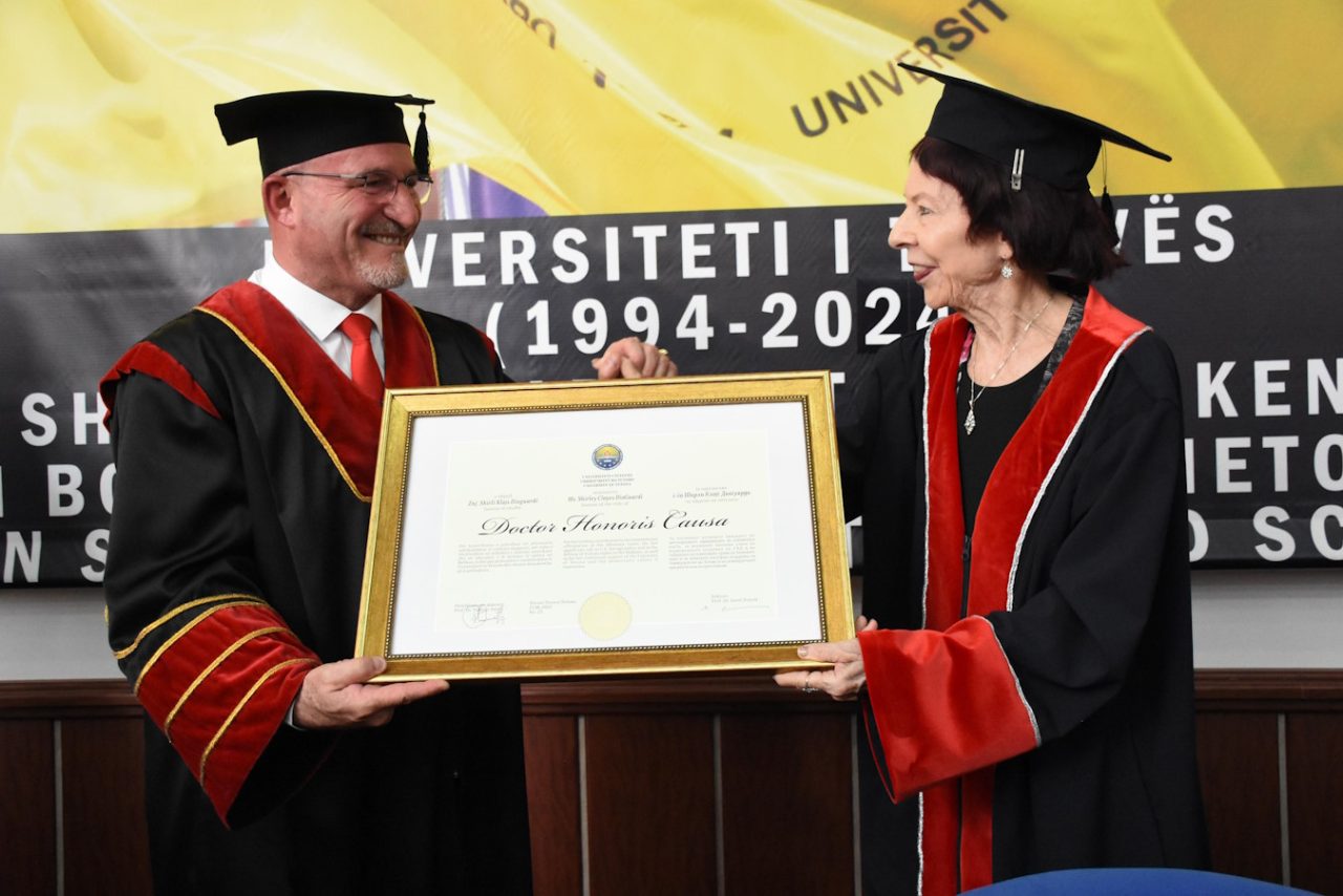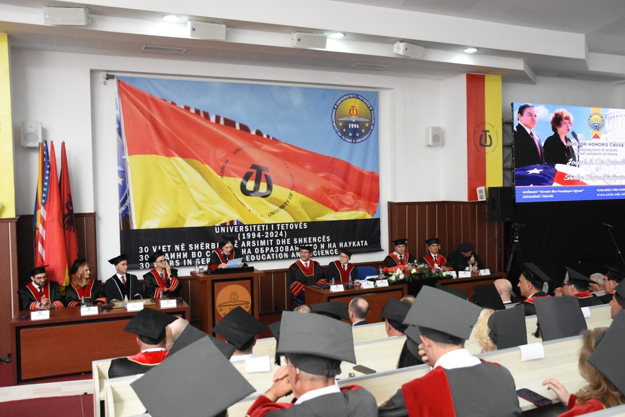 Me një Akademi solemne, në Amfiteatrin “Sevasti dhe Parashqevi Qiriazi” të Universitetit të Tetovës, në praninë e studentëve, profesorëve dhe dhjetëra personaliteteve të njohura, më 13 qershor 2025, janë laureuar me titullin Doctor Honoris Causa, z. Joseph J. DioGuardi dhe znj. Shirley Cloyes DioGuardi, dy personalitete të rëndësishme që punuan pareshtur dhe me përkushtim të pashoq për lirinë dhe demokratizimin e rajonit tonë. Dy zëra të fuqishëm dhe mbrojtës të palodhur të të drejtave të shqiptarëve, qoftë në Kongresin Amerikan, qoftë nëpër forume të ndryshme ndërkombëtare, pikërisht në periudhat më të vështira për popullin shqiptar.